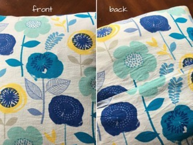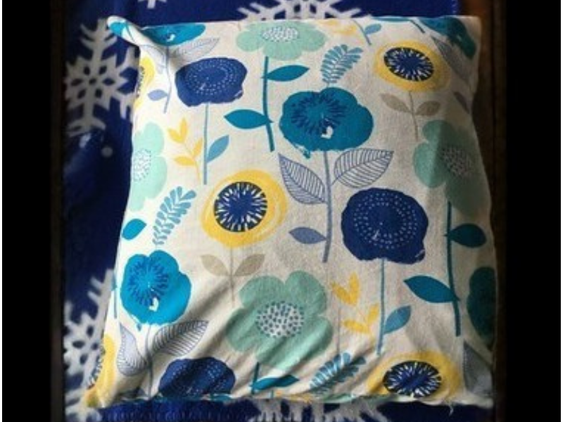 I started by washing and drying my fleece throw. Fleece is an EXCELLENT material to start with, because it doesn’t fray when you cut it. It’s also stretchy and very forgiving. Below is a picture of the pillows I chose to cover. The flower material is actually a cover I made earlier this year! As you can see, the back has an open flap like a fold down envelope. We’ll be doing the same with the blanket.
