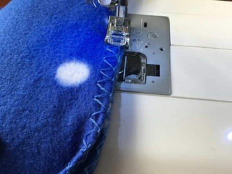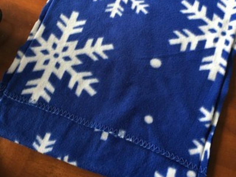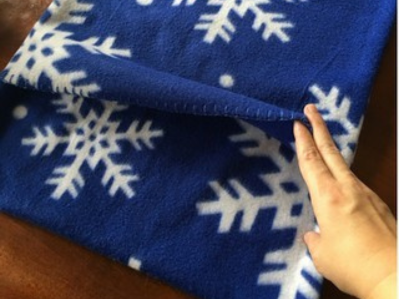 Confession, I am a lazy seamstress. You can absolutely pin each side down to make absolutely sure everything is even. If I can get away with not pinning anything, well, that’s my type of project! 😉 Sew down the length of both sides. The majority of it will be 3 pieces of material since you’ve folded the fleece into thirds.