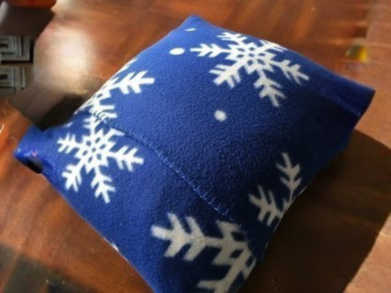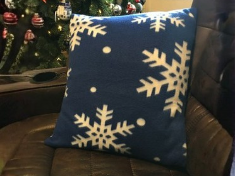 I kept it SUPER simple. Lay your blanket out and measure the width of your pillow. Standard pillows are usually 17″x17″. I measured 17″ wide because I like a fitted cover and I knew the fleece would stretch around the pillow nicely. Cut the length of the blanket.