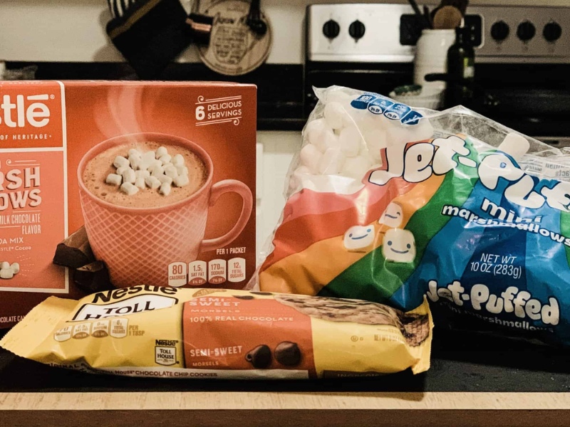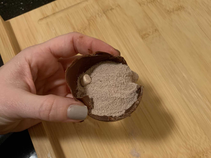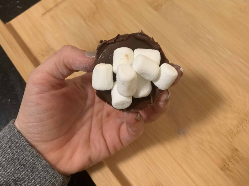 - Even out the sides, pour hot chocolate mix in one side and marshmallows in the other and fuse together…you may need some melted chocolate to glue the sides together.