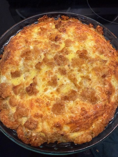 • Remove hash browns from oven and mash into an even layer covering the sides and bottom of the pie dish.