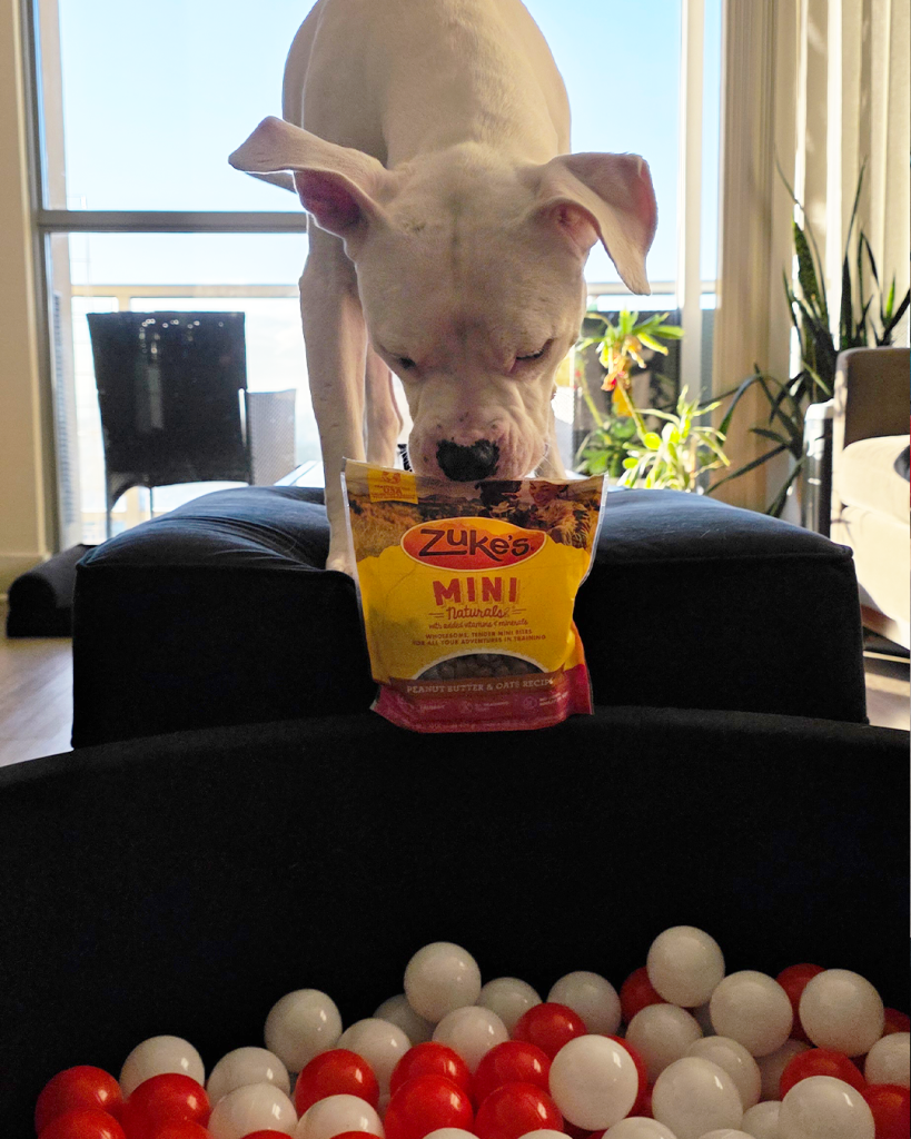 Zuke’s treats were perfect for this kind of game. They’re small enough to hide easily but flavorful enough to keep him motivated, which meant the game lasted longer and stayed engaging without turning into frustration. By the end, every treat had been found, the ball pit was completely rearranged, and I had one very happy, very tired dog sprawled out on the floor like he’d just accomplished something major.